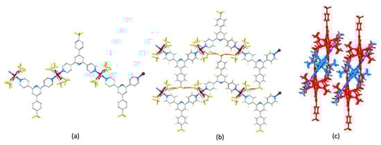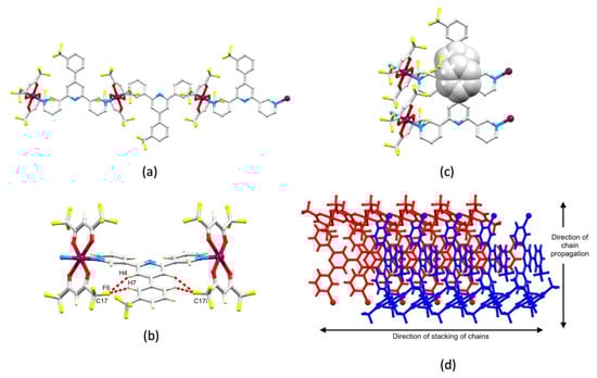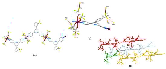 Ligand 1 presents a V-shaped building block and, combined with the trans-arrangement of the pyridine donors in the Cu(II) coordination sphere, this leads to a zigzag 1D-polymer chain in [Cu2(hfacac)4(1)2]n·2nC6H4Cl2 (Figure 3a). The chains associate through short C–F...F–C interactions (Figure 3b) with F...F distances of 2.92, 2.97, 2.76 and 2.93 Å, which are less than or similar to the sum of the van der Waals radii (2.92–2.94 Å) [,]. These contacts involve the ordered CF3 groups containing C13, C27 and C32 (Figure S13). Although distinct from halogen bonds [], weak F...F contacts are recognized as contributing towards crystal packing interactions [,,]. At first glance, the packing shown in Figure 3b appears to be reminiscent of the characteristic nesting of zigzag chains in [Cu2(μ-OAc)4(4′-X-4,2′:6′,4″-tpy)]n to form 2D-sheets [,,]. However, the chains in [Cu2(hfacac)4(1)2]n·2nC6H4Cl2 are offset (highlighted in red in Figure 3c) and a second set of chains slices obliquely through the first as shown in Figure 3c. Interestingly, π-stacking interactions between ligands 1 do not contribute to the packing interactions, although the 1,2-dichlorobenzene solvate molecule does form face-to-face π-stacking contacts with the central pyridine ring of 1 (centroid…centroid = 3.78 Å, angle between the ring planes = 3.0°).
