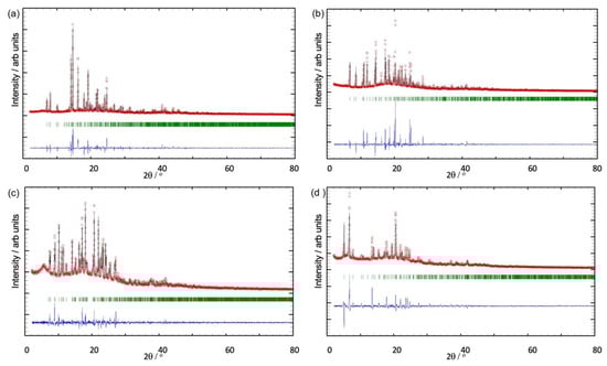- Pawley, G.S. Unit-cell refinement from powder diffraction scans. J. Appl. Cryst. 1981, 14, 357–361. [Google Scholar] [CrossRef]