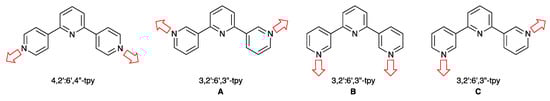- Housecroft, C.E.; Constable, E.C. Isomers of terpyridine as ligands in coordination polymers and networks containing zinc(II) and cadmium(II). Molecules 2021, 26, 3110. [Google Scholar] [CrossRef]