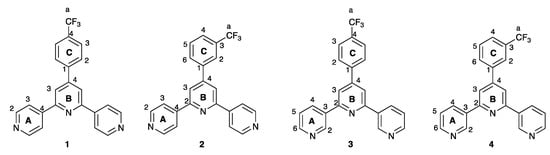Compounds 1 and 2 were significantly less soluble in common organic solvents than 3 and 4, and DMSO-d6 was used for recording NMR spectra. While 3 and 4 dissolved easily in DMSO-d6 under ambient conditions, complete dissolution of 1 and 2 was achieved only with heating. Precipitation of 1 in the NMR tube resulted in broadened signals in the 1H NMR spectrum. The 1H and 31C{1H} NMR spectra of compounds 1–4 were assigned using 2D-methods, and were consistent with the structures shown in Scheme 3. A singlet at around δ –61 ppm (see Section 3.2, Section 3.3, Section 3.4 and Section 3.5) was observed in the 19F{1H} NMR spectrum of each compound, consistent with one CF3 environment. The 1H NMR spectra are compared in Figure S10, while Figure S11 displays the 31C{1H} NMR spectra. While compound 1 is C2 symmetric on the NMR timescale, the symmetry is lowered on moving the CF3 substituent from the 4- to 3-position of the 4′-phenyl ring (Figure S10, 1 to 2). A comparison of the spectra of 1 and 3, and of 2 and 4 in Figure S10 shows the effects of going from the 4,2′:6′,4″- to 3,2′:6′,3″-tpy domain while retaining the CF3 group in a common position. Similar effects are seen by comparing the 31C{1H} NMR spectra in Figure S11. The characteristic quartets for Ca (see Scheme 3) with JCF = 272 Hz, and for CC3 or CC4 (JCF = 31 Hz) are highlighted in Figure S11.