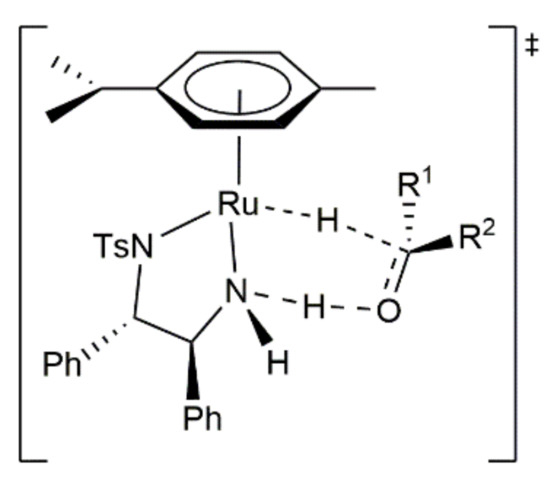 Transfer hydrogenation reactions with these catalysts proceed through a ligand-assisted outer-sphere mechanism in which the substrate to be reduced has no direct interaction with the metal center. Instead, a six-membered ring transition state, generated by H-bonding interaction between the hydride and amine ligands of 3 with the substrate, takes place (Figure 1). This interaction allows for the simultaneous transfer of the hydride and NH proton, thus leading to the reduced product and the regeneration 2 [51]. The catalyst is configurationally defined at the Ru center because a favored diastereoisomer of the hydride intermediate 3 is generated during each cycle and its chirality is relayed to the product, which explains the high enantioselectivities usually observed.