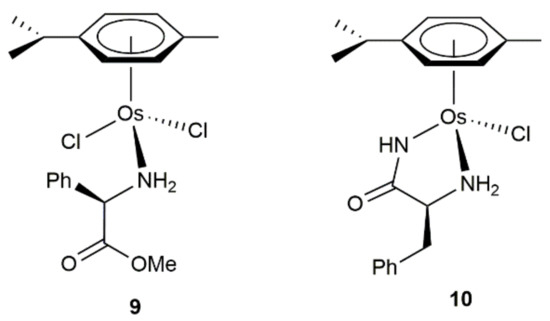 Structure of the amino acid derived Os(II) complexes 9 and 10.