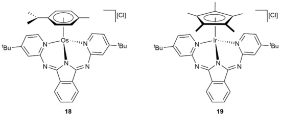 Transfer hydrogenation of acetophenone and cyclohexanone by 2-propanol was also successfully accomplished by Gade and co-workers with the cationic complex 18 containing a κ3-(N,N,N)-coordinated bis(pyridylimino)isoindolate ligand (Figure 6) [66]. Thus, performing the reactions at 80 °C with 5 mol% of 18, in conjunction with KOH, the corresponding alcohols were generated in quantitative yield after 2 h, results comparable to those achieved with the related Ir(III) derivative 19.