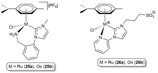 Some years later, Morris and co-workers synthesized the osmium complex 25b, featuring a chelating NHC ligand with a tethered primary amine donor (Figure 7), and compared its catalytic behavior in the hydrogenation of acetophenone with that of the analogue ruthenium(II) derivative 25a [70]. Both complexes required the presence of base (KOtBu) to operate, with the activity of 25b being remarkably lower than that of 25a (23% conversion after 3 h at 50 °C in iPrOH using 25 bar of H2 and a catalyst/substrate/base ratio of 1/8/200 vs quantitative conversion after 1.5 h under identical conditions). The higher oxophilic nature of osmium, capable to form more stable intermediate alkoxo complexes, was invoked by the authors to explain the difference in activity found. Similar observations were made by Kühn and co-workers when studying the hydrogenation and transfer hydrogenation of acetophenone in aqueous medium with the hydrophilic complexes 26a-b (see Figure 7) [71].