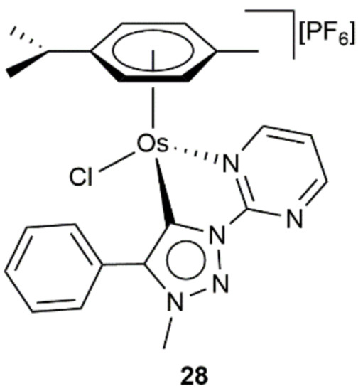 In a subsequent study, the same group described the synthesis and catalytic behavior of the related pyrimidine-based mesoionic carbene Os(II) complex 28 (see Figure 8), which showed an effectiveness comparable to that of 27b–c in the transfer hydrogenation of benzaldehyde, acetophenone, benzophenone, and cyclohexanone [73]. In addition, in the same study, the utility of compounds 27 and 28 to promote the transfer hydrogenation of olefins, imines and nitroaromatics was also briefly explored, the results obtained being strongly dependent on the nature of the substrates employed and inferior in all cases to those reached with the corresponding ruthenium(II) analogues.