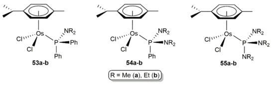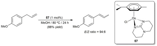 The participation of arene-osmium(II) complexes in olefin metathesis reactions can also be found in the literature. For example, Hafner and co-workers reported that, under ultraviolet irradiation, compounds [OsCl2(η6-p-cymene)(PR3)] (R = Cy, iPr) are able to promote the rapid ROMP of norbornene without the need of a diazomethane activator [91]. The presence of a sterically demanding phosphine ligand seems to play a key role in the photoactivation of these compounds since very slow or no polymerization was observed with the related species [OsCl2(η6-p-cymene)(PR3)] (R = Me, nBu, Ph). However, it should be noted that the reactivity of [OsCl2(η6-p-cymene)(PR3)] (R = Cy, iPr) in this polymerization process was much lower to that of complexes [RuCl2(η6-p-cymene)(PR3)] (R = Cy, iPr).