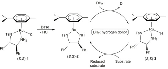 During the last three decades, metal-catalyzed transfer hydrogenation processes have attracted a great academic interest [44,45,46], representing nowadays a reliable synthetic tool for the reduction of carbonyl compounds and other unsaturated substrates, which in addition has found applications in industry [47,48]. A wide range of transition- and main group-metals have been successfully involved in such transformations, with ruthenium complexes playing a prominent role [44]. In this context, we must highlight the arene-ruthenium(II) derivatives (R,R)- and (S,S)-[RuCl(η6-p-cymene){TsNCH(Ph)CH(Ph)NH2}] (1; Ts = p-toluenesulfonate), reported by Noyori and co-workers at the end of 1990s [49,50], capable to reduce a broad range of substrates in high yields and with an outstanding enantioselectivity (up to > 99% ee). The key point for their high activity and stereoselection lies in the presence of a NH2 group coordinated to the metal center and the formation of the 16-electron complexes [Ru(η6-p-cymene){TsNCH(Ph)CH(Ph)NH}] (2) and the hydride derivatives [RuH(η6-p-cymene){TsNCH(Ph)CH(Ph)NH2}] (3), that have been identified as the active species of the catalytic cycle (Scheme 1).