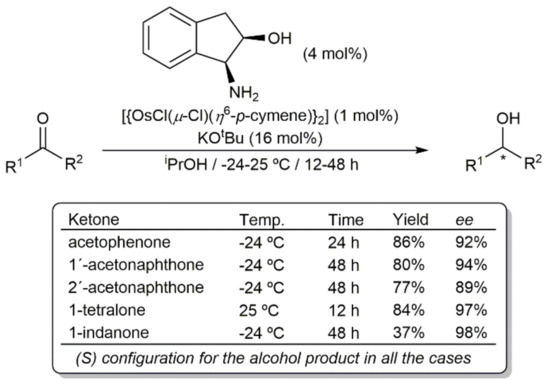 Asymmetric transfer hydrogenation of ketones using 2-propanol as solvent and hydrogen donor was successfully accomplished by Faller and Lavoie with an arene-osmium(II) catalyst generated in situ from dimer [{OsCl(μ-Cl)(η6-p-cymene)}2] and the chiral amino-alcohol ligand (1R,2S)-(+)-cis-1-amino-2-indanol (Scheme 3) [58]. The process, which required of the assistance of a base (KOtBu), was highly enantioselective, yielding the corresponding alcohol products with ee´s ≥ 89%. It is worth mentioning that both the conversions and enantioselectivities observed in these reactions were comparable to those previously described with the [{RuCl(μ-Cl)(η6-p-cymene)}2]/(1R,2S)-(+)-cis-1-amino-2-indanol combination [59].
