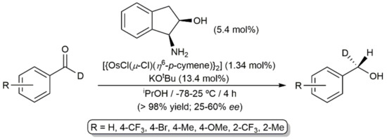 The same catalytic system was further employed for the asymmetric transfer hydrogenation of different para- and ortho-substituted benzaldehyde-α-d derivatives [60]. As shown in Scheme 4, the corresponding alcohols were in all the cases generated in almost quantitative yield, albeit with only a modest to moderate enantioselectivity (up to 60% ee). As in the precedent case, similar conversions and enantiomeric excesses (26–68% ee), were reached when [{RuCl(μ-Cl)(η6-p-cymene)}2], or the related chloride-bridged dimers [{RhCl(μ-Cl)Cp*}2] and [{IrCl(μ-Cl)Cp*}2] (Cp* = pentamethylcyclopentadienyl), were used as the metal sources.