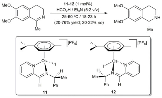 Within the field of asymmetric transformations, we must finally mention that Sadler and co-workers reported on the transfer hydrogenation of the cyclic imine 6,7-dimethoxy-1-methyl-3,4-dihydroisoquinoline with the iodide osmium(II) complexes 11 and 12, employing formic acid as the hydrogen source (Scheme 5) [64]. Compounds 11 and 12 were generated by reacting methanolic solutions of dimer [{OsI(μ-I)(η6-p-cymene)}2] with N-(2-pyridylmethylene)-(S)-phenylethylamine and N-(2-pyridylmethylene)-(R)-phenylethylamine, respectively, in the presence of NH4PF6, and isolated in a diastereomerically pure manner by fractional crystallization. As shown in the scheme, their catalytic activities were only moderate and their chiral induction very low.