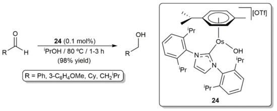On the other hand, the involvement of arene-osmium(II) complexes with N-heterocyclic carbene (NHC) ligands as catalysts in hydrogenation and transfer hydrogenation processes has also been documented. In this context, the first example was described by Castarlenas, Esteruelas, and co-workers in 2008, who demonstrated the ability of the 16-electron hydroxo complex [Os(OH)(η6-p-cymene)(IPr)][OTf] (24; IPr = 1,3-bis(2,6-diisopropylphenyl)imidazole-2-ylidene) to promote the transfer hydrogenation of aldehydes by 2-propanol under base-free conditions [69]. As shown in Scheme 8, the primary alcohol products were obtained in excellent yield (98% in all the cases) and short times by performing the catalytic reactions at 80 °C with 0.1 mol% of 24 (TOF up to 980 h−1). Complex 24 was also active in the reduction of acetophenone, but a longer reaction time (22 h) and a higher catalyst loading (1 mol%) was in this case needed to obtain the desired 1-phenylethanol in only 72% yield (TOF = 3.3 h−1). The behavior of 24 towards 2-propanol was explored by the authors, observing the clean and immediate formation at −30 °C of the hydride derivative [OsH{κ1-(O)-O=CMe2}(η6-p-cymene)(IPr)][OTf], which probably acts as the catalytically active species.
