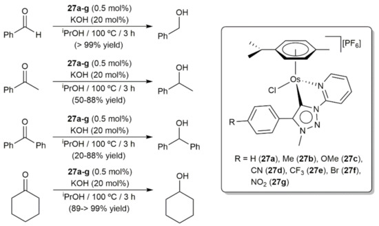 Transfer hydrogenation reactions from 2-propanol to carbonyl compounds were described by Košmrlj, Sarkar, and co-workers employing the cymene-osmium(II) complexes 27a–g, featuring chelating pyridyl-mesoionic carbene ligands, in conjunction with KOH (Scheme 9) [72]. As a general trend, those complexes bearing electron donating substituents on the ligand backbone, i.e., 27b and 27c, showed superior performances in comparison to the non-substituted one 27a and those substituted with electron-withdrawing groups, i.e., 27d–g. The same catalytic reactions were simultaneous studied, under identical conditions, with analogous cymene-ruthenium(II) complexes, observing for the reduction of benzaldehyde almost identical results. However, in the case of acetophenone, benzophenone, and cyclohexanone, the ruthenium complexes led in general to higher yields.