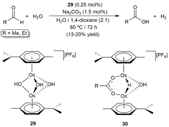 Despite the fact that osmium compounds are widely employed to promote oxidation processes [74,75,76,77,78], examples involving low-valent arene-osmium(II) complexes are still very scarce. In this context, in an early report, Maitlis and co-workers showed that the cationic dinuclear tri-μ-hydroxo derivative [{Os(η6-p-cymene)}2(μ-OH)3][PF6] (29) is able to catalyze the oxidation of acetaldehyde and propionaldehyde by water to generate the corresponding carboxylic acids, reactions in which molecular hydrogen is also produced (Scheme 10) [79]. Although the yields were very poor and comparatively lower than those obtained with its ruthenium counterpart, i.e., [{Ru(η6-p-cymene)}2(μ-OH)3][PF6], complex 29 showed a greater selectivity towards the formation of the carboxylic acids since ruthenium also catalyzes the competing disproportionation of the aldehydes into the respective alcohols and carboxylic acids. In the same work, the reactivity of [{Os(η6-p-cymene)}2(μ-OH)3][PF6] (29) towards acetaldehyde and propionaldehyde under stoichiometric conditions was also explored, the reactions performed in water allowing the isolation of compounds [{Os(η6-p-cymene)}2(μ-H)(μ-OH)(μ-O2CR)][PF6] (30) which probably participate as intermediates in the catalytic reactions.