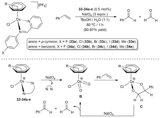 The group of Friedrich synthesized a series of cationic arene-osmium(II) complexes 33–34a-e with bidentate imino-pyridine ligands which catalyzed efficiently the selective oxidation of styrene to benzaldehyde with NaIO4 (Scheme 12) [81]. From a mechanistic point of view, spectroscopic evidence indicated that the reactions proceed through the initial oxidation of complexes 33–34a-e by NaIO4 to generate the dioxo arene-osmium(VI) species B with release of the N,N-donor ligands. Subsequent [3 + 2] cycloaddition between B and the C = C bond of the styrene molecule leads to the Os(IV) intermediates C from which benzaldehyde, as well as the secondary product formaldehyde, are liberated after reaction with NaIO4. On the other hand, the generality of this oxidation process was conveniently confirmed with complex 33d, which was able to convert 4-methoxystyrene, 4-methylstyrene, 4-clorostyrene, trans-stilbene, and 1-octene into the corresponding aldehydes in equally good yields (85–99%) and short times (0.5–1 h).