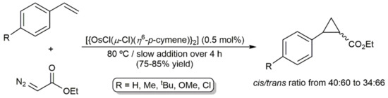 Involvement of arene-osmium(II) complexes in catalytic C-C bond forming processes was described for the first time by Demonceau and co-workers in 1996 [84]. As shown in Scheme 13, they found that dimer [{OsCl(μ-Cl)(η6-p-cymene)}2] was able to promote efficiently the cyclopropanation of styrene derivatives with ethyl diazoacetate (EDA) at 80 °C with stereoselectivities (cis/trans ratios) comparable to those previously reported for more classical rhodium- and ruthenium-based systems. They also explored with little success the behavior of [{OsCl(μ-Cl)(η6-p-cymene)}2] towards non-activated linear and cyclic olefins. For example, cyclopropanation of cyclooctene by EDA under identical experimental conditions led to the desired cyclopropane product in only 25% yield along with minor amounts (ca. 3%) of the corresponding polymer resulting from the ring-opening metathesis polymerization (ROMP) of the substrate [84]. This result contrast with that obtained with [{RuCl(μ-Cl)(η6-p-cymene)}2] which showed to catalyze preferentially the ROMP process.