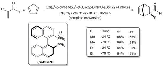 In the context of their studies on the coordination of bidentate bisphosphine monoxide ligands to half-sandwich ruthenium(II) and osmium(II) fragments [86,87,88], Faller and Parr synthesized the dicationic 16-electron derivative [Os(η6-p-cymene){κ2-(P,O)-(S)-BINPO}][SbF6]2 ((S)-BINPO = monoxide of the chiral diphosphine (S)-BINAP) which proved to be an excellent Lewis acid catalyst for the asymmetric Diels–Alder reaction of cyclopentadiene with methacrolein and ethylacrolein [87]. As shown in Scheme 15, the exo adducts were almost exclusively formed (dr ≥ 94%) with high enantioselectivity levels. Remarkably, the ee values observed (65–93%) surpassed those obtained with [Ru(η6-p-cymene){κ2-(P,O)-(S)-BINPO}][SbF6]2 (ee up to 50%). In addition, when using the ruthenium catalyst, the addition of a base (lutidine) was required, the ee values dropping to 5–27% in its absence [88].