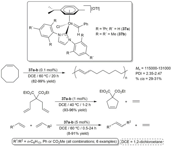 In a more general study, Esteruelas and co-workers demonstrated the utility of the benzylidene-osmium(II) complexes 37a-b, synthesized by reaction of the corresponding 16-electron precursors [OsCl(η6-p-cymene)(NHC)][OTf] (NHC = 1,3-bis(2,6-diisopropylphenyl)imidazole-2-ylidene (IPr) or 1,3-bis(2,4,6-trimethylphenyl)imidazole-2-ylidene (IMes)) with phenyldiazomethane, as catalysts for the ROMP of cyclooctene, the ring-closing metathesis (RCM) of diethyl diallylmalonate and the self- and cross-metathesis (CM) of a variety of alkenes (Scheme 17) [92]. At the beginning of the reactions the presence of free p-cymene was observed by gas chromatography-mass spectrometry (GC-MS) in the catalytic solutions, indicating that complexes 37a-b are transformed into the 12-electron species [OsCl(=CHPh)(NHC)]+ which are the real initiators in these metathesis processes. Although 37a-b were not as efficient as the standard ruthenium-based Grubbs catalysts, they displayed a decent activity that should be taken into account when designing future osmium-based olefin metathesis catalysts.