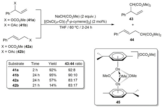 Esteruelas and co-workers also demonstrated that arene-osmium(II) complexes can promote more classical allylic alkylation C-C bond forming reactions [100]. In particular, they screened the catalytic behavior of dimer [{OsCl(μ-Cl)(η6-p-cymene)}2], and a series of mononuclear derivatives [OsCl2(η6-p-cymene)(L)] (L = phosphite or phosphoramidite ligand), in the alkylation of 1-phenylallyl methylcarbonate (41a), 1-phenylallyl acetate (41b), cinnamyl methylcarbonate (42a) and cinnamyl acetate (42b) with sodium dimethylmalonate. The efficiency of the process was strongly dependent on the leaving group and the branched or linear nature of the substrates, with dimer [{OsCl(μ-Cl)(η6-p-cymene)}2] showing the best catalytic performances. Thus, as shown in Scheme 19, the alkylation was more effective for carbonates vs acetates and for branched vs linear substrates, with the formation of the branched product 43 being in all the cases preferred. Mechanistic investigations on the alkylation reaction of 41a with NaCH(CO2Me)2 indicated that the dinuclear derivative [{Os(η6-p-cymene)}2(µ-OMe)3][OCO2Me] (45), which could be isolated and fully characterized by reacting [{OsCl(μ-Cl)(η6-p-cymene)}2] with excess of 41a, acts the real catalytically active species in the process.