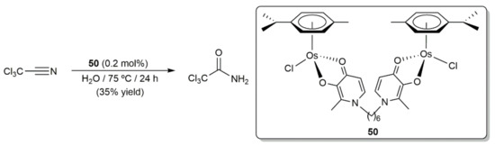- González-Fernández, R.; Crochet, P.; Cadierno, V. Arene-ruthenium(II) and osmium(II) complexes as catalysts for nitrile hydration and aldoxime rearrangement reactions. Inorg. Chim. Acta 2021, 517, 120180. [Google Scholar] [CrossRef]