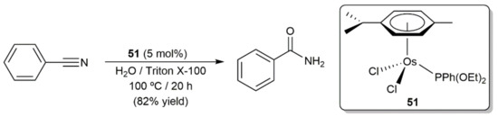- González-Fernández, R.; Crochet, P.; Cadierno, V.; Menéndez, M.I.; López, R. Phosphinous Acid-Assisted Hydration of Nitriles: Understanding the Controversial Reactivity of Osmium and Ruthenium Catalysts. Chem. A Eur. J. 2017, 23, 15210–15221. [Google Scholar] [CrossRef]