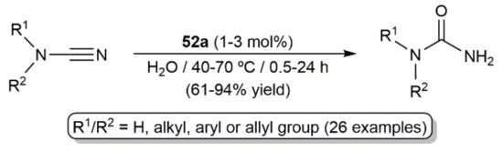 - González-Fernández, R.; Álvarez, D.; Crochet, P.; Cadierno, V.; Menéndez, M.I.; López, R. Catalytic hydration of cyanamides with phosphinous acid-based ruthenium(ii) and osmium(ii) complexes: Scope and mechanistic insights. Catal. Sci. Technol. 2020, 10, 4084–4098. [Google Scholar] [CrossRef]
