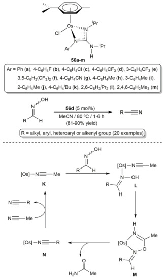 - Francos, J.; González-Liste, P.J.; Menéndez-Rodríguez, L.; Crochet, P.; Cadierno, V.; Borge, J.; Antiñolo, A.; Fernández-Galán, R.; Carrillo-Hermosilla, F. Half-sandwich guanidinate-osmium(II) complexes: Synthesis and application in the selective de-hydration of aldoximes. Eur. J. Inorg. Chem. 2016, 2016, 393–402. [Google Scholar] [CrossRef]