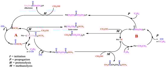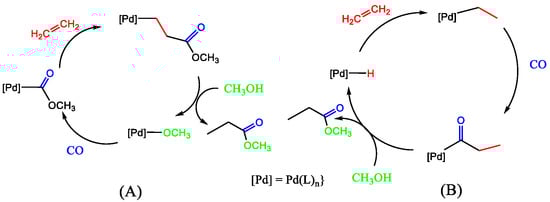 - Liu, J.; Heaton, B.T.; Iggo, J.A.; Whyman, R. The Complete Delineation of the Initiation, Propagation, and Termination Steps of the Carbomethoxy Cycle for the Carboalkoxylation of Ethene by Pd–Diphosphane Catalysts. Angew. Chem. Int. Ed. 2004, 43, 90–94. [Google Scholar] [CrossRef]