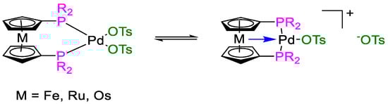 - Gusev, O.V.; Kalsin, A.; Peterleitner, M.G.; Petrovskii, P.V.; Lyssenko, K.; Akhmedov, N.G.; Bianchini, C.; Meli, A.; Oberhauser, W. Palladium(II) Complexes with 1,1′−Bis(diphenylphosphino)ferrocenes [Fe(η5-C5R4PPh2)2]n+ (dppf, R = H, n = 0; dppomf, R = Me, n = 0; dppomf+, R = Me, n = 1). Synthesis, Characterization, and Catalytic Activity in Ethene Methoxycarbonylation. Organometallics 2002, 21, 3637–3649. [Google Scholar] [CrossRef]