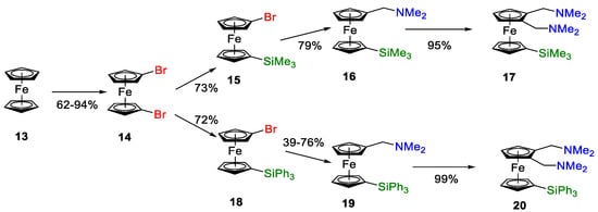 - Hadlington, M.; Rockett, B.W.; Nelhans, A. Unsymmetrically disubstituted ferrocenes. Part I. Synthesis of 1,2-disubstituted ferrocenes by metallation and nucleophilic substitution reactions. J. Chem. Soc. C 1967, 1436–1440. [Google Scholar] [CrossRef]