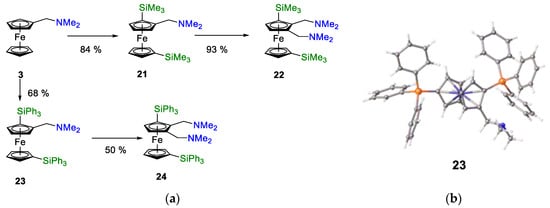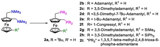 - Butler, I.R.; Cullen, W.R.; Rettig, S.J. Synthesis of derivatives of [.alpha.(dimethylamino)ethyl]ferrocene via lithiation reactions and the structure of 2-[.alpha.-(dimethylamino)ethyl]-1,1’,3-tris(trimethylsilyl)ferrocene. Organometallics 1986, 5, 1320–1328. [Google Scholar] [CrossRef]
