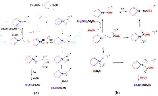 - Eastham, G.R.; Tooze, R.P.; Kilner, M.; Foster, D.F.; Cole-Hamilton, D.J. Deuterium labelling evidence for a hydride mechanism in the formation of methyl propanoate from carbon monoxide, ethene and methanol catalysed by a palladium complex. J. Chem. Soc. Dalton Trans. 2002, 1613–1617. [Google Scholar] [CrossRef]