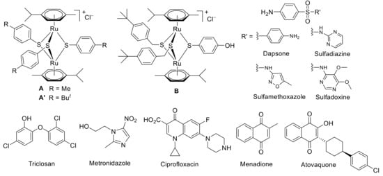 Desiatkina, O.; Johns, S.K.; Anghel, N.; Boubaker, G.; Hemphill, A.; Furrer, J.; Păunescu, E. Synthesis and Antiparasitic Activity of New Conjugates—Organic Drugs Tethered to Trithiolato-Bridged Dinuclear Ruthenium(II)–Arene Complexes. Inorganics 2021, 9, 59. https://doi.org/10.3390/inorganics9080059