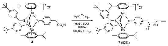 - Chérioux, F.; Thomas, C.M.; Monnier, T.; Süss-Fink, G. Specific reactivity of SH versus OH functions towards dinuclear arene ruthenium units: Synthesis of cationic complexes of the type [(arene)2Ru2(SR)3]+. Polyhedron 2003, 22, 543–548. [Google Scholar] [CrossRef]