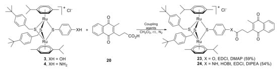 - Giannini, F.; Furrer, J.; Ibao, A.-F.; Süss-Fink, G.; Therrien, B.; Zava, O.; Baquie, M.; Dyson, P.J.; Stěpnička, P. Highly cytotoxic trithiophenolatodiruthenium complexes of the type [(η6-p-MeC6H4Pri)2Ru2(SC6H4-p-X)3]+: Synthesis, molecular structure, electrochemistry, cytotoxicity, and glutathione oxidation potential. J. Biol. Inorg. Chem. 2012, 17, 951–960. [Google Scholar] [CrossRef] [PubMed]