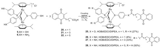 - Kubanik, M.; Kandioller, W.; Kim, K.; Anderson, R.F.; Klapproth, E.; Jakupec, M.A.; Roller, A.; Sohnel, T.; Keppler, B.K.; Hartinger, C.G. Towards targeting anticancer drugs: Ruthenium(II)-arene complexes with biologically active naphthoquinone-derived ligand systems. Dalton Trans. 2016, 45, 13091–13103. [Google Scholar] [CrossRef] [PubMed]