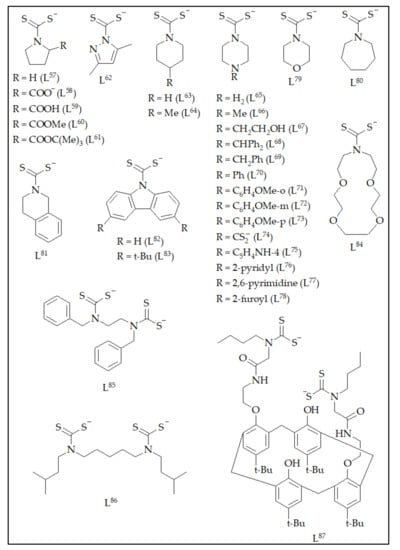 Chemical diagrams of dithiocarbamates L57 to L87.