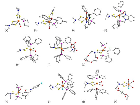The common feature of organometallic species 22–49 is the presence of at least one carbonyl ligand: indeed, all but 48 (two) and 49 (three) have one terminally bound carbonyl group. In each of 22 [] and 23 [], there are two dithiocarbamate ligands while the remaining structures have one dithiocarbamate each. In 22, Figure 4a, the ruthenium(II) center is bis chelated by two dithiocarbamate ligands with the distorted octahedral geometry completed by the phosphane and carbonyl ligands. In 23, Figure 4b, one of the dithiocarbamate ligands of 22 now bridges an already coordinated germanium atom, forming one bond to each atom with the resultant octahedral coordination geometry based on a CGePS3 donor set. The common feature of 24–26 [] is a CNPS2Si donor set as one of the chelating dithiocarbamate ligands of 22 is replaced by a Si∩N chelating ligand with the difference in structures related to the backbone of the Si∩N chelating ligand; the molecule in 24 is shown in Figure 4c. In 27 [], the dithiocarbamate and phosphane ligands of 22 are replaced by a tridentate ligand where coordination occurs from the ring-boron atom and two pendant phosphane ligands, Figure 4d. Thus, this is the first example where ruthenium is coordinated by two phosphane ligands representing a key structural difference from 22–26. The common feature of the complexes in the crystals of 28–47 is that they conform to the general formula (PPh3)2Ru(Ln)(CO)Y. For 28 [], 29 [], Figure 4e, and 30 [], Y is a hydride. In common with all structures up to an including 43, the phosphane ligands are mutually trans. Similar arrangements are found in 31 [] and 32 [] where the hydride has been substituted for Si(Cl)Ph2 and Ge(p-tolyl)3 groups, respectively.