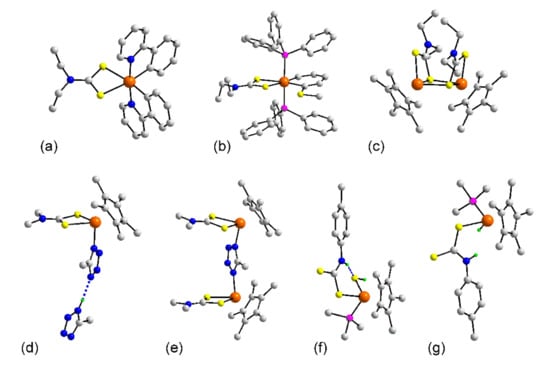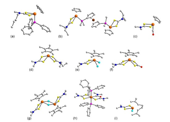 - Rheingold, A.L.; Reger, D.L. Chloro-(diethylcarbamodithioato)-(triethylphosphine)-platinum. CSD Commun. 2019. [Google Scholar] [CrossRef]