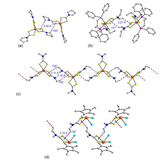 As mentioned in the Introduction, crystals of metal dithiocarbamates are prone to display assemblies featuring C–H⋯π(metal-S2C) interactions [,,]. While the focus of the present overview is upon molecular geometries, it is worth highlighting some examples drawn from the ruthenium dithiocarbamates 1–72 where C–H⋯π(RuS2C) interactions are evident in their crystals. In Figure 6a, a supramolecular dimer is formed in the crystal of 3 through intermolecular C–H⋯π(RuS2C) interactions occurring between centrosymmetrically related molecules. A similar aggregate is formed in the crystal of 8 despite the presence of bulky phosphane ligands. Supramolecular chains are also evident, for example in the crystal of 1 where a zigzag chain is evident with each independent molecule forming on average two C–H⋯π(RuS2C) interactions. In the crystal of 58, a helical chain features C–H⋯π(RuS2C) interactions.