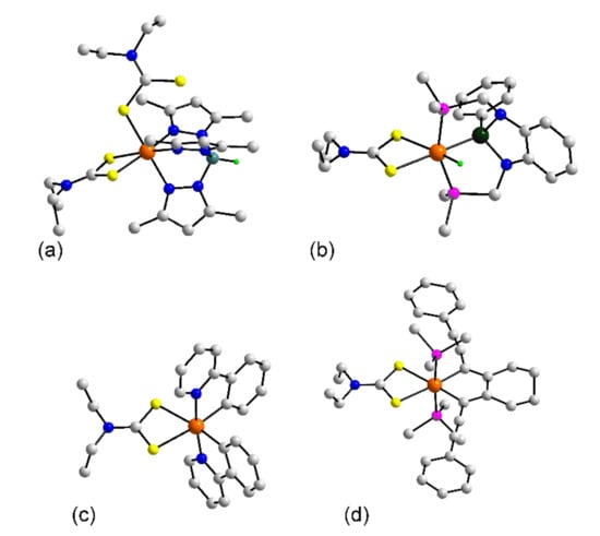 In keeping with the predominance of octahedral coordination geometries about the rhodium dithiocarbamate structures in 73–77, in 73 [], one of the dithiocarbamate ligands adopts a relatively rare monodentate mode of coordination while the other retains its usual chelating mode. The three remaining positions in the octahedral geometry are occupied by the nitrogen atoms of the tripodal Tp* ligand, Figure 7a. Figure 7b gives a representation of the hydride in 74 []. Stabilization to the molecule is provided by the tripodal ligand which coordinates by the central silicon atom and the two phosphorus atoms leading to a HP2S2Si donor set as the dithiocarbamate ligand is coordinating in the anticipated chelating mode. The molecules in 75 [], Figure 7c, and 76 [], are closely related with the rhodium atom being coordinated by a chelating dithiocarbamate ligand and two C,N-chelating 2-(pyridin-2-yl)phenyl ligands with the nitrogen atoms being mutually trans. Finally, in 77 [], Figure 7d, a C2P2S2 donor set is apparent owing to the presence of a chelating 1,2-bis(2-phenylethynylmethylene)cyclohexane ligand, the phosphorus atoms are mutually trans.