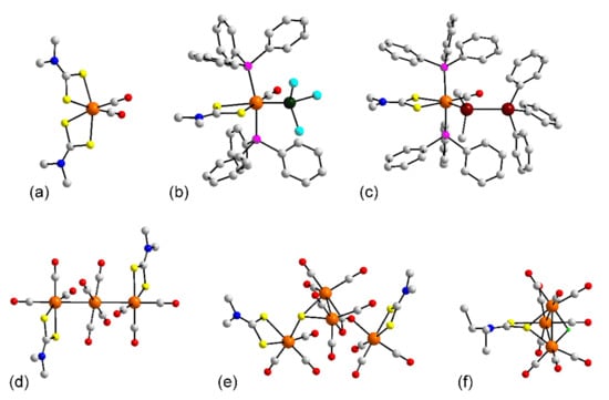 The remaining crystals feature cluster molecules having three, i.e., 173 [], 175 [], and 176 [] or four, 174 [] osmium atoms. In 173, Figure 10d, the terminal osmium atoms in a chain of three osmium atoms are each chelated by a dithiocarbamate ligand, with further coordination provided by three carbonyl ligands and the octahedral geometry completed by the central osmium atom; the latter features a C4Os2 donor set. In the tetranuclear cluster of 174, Figure 10e, again each terminal osmium atom is chelated by a dithiocarbamate ligand. The coordination geometry for one of the osmium atoms is based on a C3S3 donor set as three of the osmium atoms are µ3-bridged by a sulfide-S atom while the second terminal osmium atom has a C3OS2 coordination geometry as the µ3-carbon dioxide atom employs all three atoms in coordination to three different osmium atoms. Finally, the osmium atoms of 175 and 176 are arranged in a triangle. As shown for 176 in Figure 10f, the dithiocarbamate ligand forms bonds with each of the osmium atoms, forming a bond to one ring osmium atom and at the same time connects to the other two osmium atoms via the second sulfur atom. The osmium atoms that are bridged by the µ2-sulfur atom are also bridged by a µ2-hydride atom. Thus, there are two distinct coordination geometries, i.e., C3Os2S and C3HOs2S.