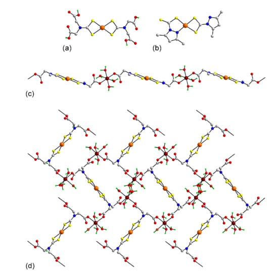 - Liebing, P.; Witzorke, J.; Oehler, F.; Schmeide, M. Dithiocarbamatocarboxylate (DTCC) ligands-building blocks for hard/soft-heterobimetallic coordination polymers. Inorg. Chem. 2020, 59, 2825–2832. [Google Scholar] [CrossRef]