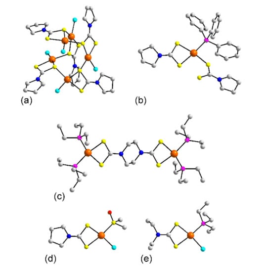 - Montagner, D.; Miguel, P.J.S. Unique Pt5 metallacycle: [PtIICl(pyrrolidinedithiocarbamate)]5. Dalton Trans. 2011, 40, 10809–10811. [Google Scholar] [CrossRef]