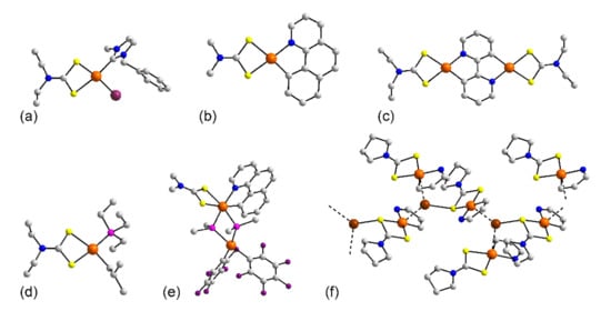 The next series of structures are organoplatinum derivatives starting with the 244 [] which is readily related to the previous series in that the chloride is now an iodide and the phosphane is replaced by the N-heterocyclic carbene, Figure 14a. The molecules in 245 [], Figure 14b, 246 [], and 247 [] contain C,N-chelating orthometallated species as well as dithiocarbamate. In a variation, doubly orthometallated 2,2′-bipyridyl links two platinum centers in 248 [], Figure 14c. Figure 14d represents 249 [] and 250 [] with CPS2 donor sets. In the final molecular structure to be described, the platinum atom of Figure 14b is linked to Pt(C6F5)2 via two diphenylphosphinato ligands resulting in a rare example of a CNP2S2 donor set in 251 [], Figure 14e. The last remaining structure to be described is a coordination polymer, i.e., in the crystal of 252 []. Here, the platinum atom is C,N-chelated by a benzo[h]quinolin-10-yl ligand with the square planar geometry completed by a chelating dithiocarbamate ligand. The latter is also connected to a silver cation which also forms connections to two platinum atoms to form a one-dimensional coordination polymer.