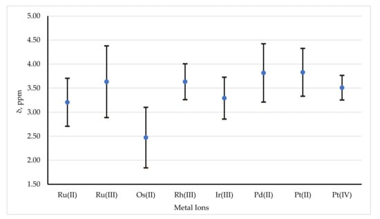 Solution 1H NMR data has been reported for dithiocarbamate complexes for all platinum-group metals, with data for palladium(II) and ruthenium(II) complexes predominating. As a consequence of restricted rotation around the carbamoyl C–N bond (see below), it is often the case that the dithiocarbamate ligand substituents give rise to two or, depending on the number of dithiocarbamate ligands and the local symmetry, occasionally more sets of resonances, which can complicate unambiguous assignment of signals, but conversely can also provide a wealth of useful information on the solution-state structures. The α-hydrogen nuclei provide the most characteristic probe. The chemical shifts vary quite significantly and typically range between about 1.80 and 4.5 ppm, depending on both the dithiocarbamate itself and the metal moiety to which it is coordinated. Table 8 shows how the mean chemical shifts and the standard deviation of these shifts varies with metal ion; Figure 15 shows the mean and 95% range (two standard deviations) for the shifts. Note that the data given in Table 8 and Figure 15 for ruthenium(II) are for dimeric complexes which are diamagnetic by virtue of spin pairing between the two ruthenium(II) centers. Although there is much overlap, Figure 15 reveals a clear trend in the mean shifts: