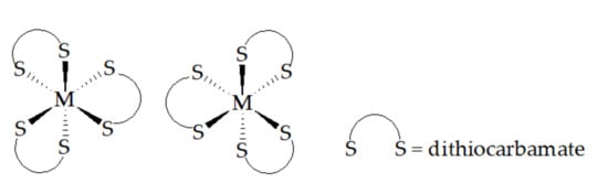 However, dithiocarbamate complexes are not just of intrinsic interest. Dithiocarbamates themselves are biologically active and when coupled with different metals, transition metals and main group elements, which often show enhanced activity, this activity can be modified, fine-tuned, and amplified [,,,,]. Dithiocarbamate complexes also show utility as single-source precursors to metal sulfide nanoparticles [,]. It is thus unsurprising there has been no let-up in recent years in the number of dithiocarbamate complexes reported in the literature. In this review, we explore recent advances in the molecular chemistry of platinum-group metal dithiocarbamate complexes, focusing on structural data acquired via X-ray crystallography and multi-NMR spectroscopy as well as an overview of potential applications. In many of these complexes, the dithiocarbamate ligands have been incorporated because of their ability to stabilize the metal moiety, allowing other, active functional groups to be present. In other cases, it is the dithiocarbamates themselves that are the primary focus of interest. In either case, without the presence of such a stable and tolerant ligand as dithiocarbamate, the potential utility of the resultant complexes is likely to be diminished.