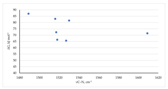 The significant contribution of resonance form (II) (Figure 1) lends substantial double bond character to the S2C–N bond, restricting rotation to an extent that, where symmetry allows, different rotomeric species are often visible in the NMR spectra at ambient temperature. Thus, for example, in cis-[Os(CO)2(L8)2], although the two dithiocarbamate ligands are equivalent, there is no plane of symmetry aligned along the C–N bond vector, rendering the methyl groups in each ligand inequivalent. Two equally intense signals, each of which integrates to six hydrogens, are observed for the NCH3 groups at ambient temperature. These signals broaden on warming and eventually coalesce at ca 90 °C []. Similarly, the methylene protons of {Pd(L13)2} [] are also inequivalent and, due to the restricted rotation about the C–N bonds are distinguishable in the NMR spectrum. Two doublets, each of integral 2, are observed at 4.75 and 5.21 ppm (2JHH = 7 Hz). Well known as the barrier to rotation is, there remain relatively few studies on the magnitude of that barrier: contemporary data for platinum-group metal complexes are collected in Table 10.