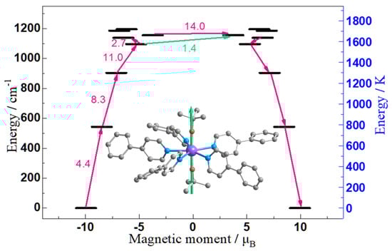 - Liu, J.-L.; Chen, Y.-C.; Zheng, Y.-Z.; Lin, W.-Q.; Ungur, L.; Wernsdorfer, W.; Chibotaru, L.F.; Tong, M.-L. Switching the Anisotropy Barrier of a Single-Ion Magnet by Symmetry Change from Quasi-D5h to Quasi-Oh. Chem. Sci. 2013, 4, 3310–3316. [Google Scholar] [CrossRef]