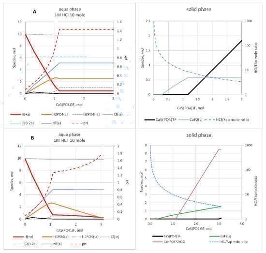 Aqua and solid-phase composition: 10 moles of 1 M HCl + FAp: (A) CaF2 in the solid phase; (B) CaF2 and CaHPO4·2H2O in the solid phase.