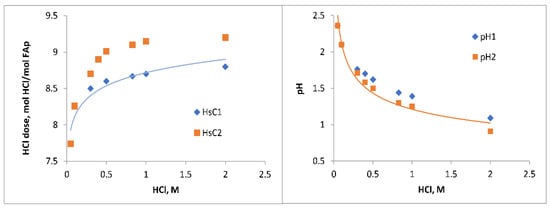 HCl amount needed for dissolution of 1 mole of FAp (HCl dose) and pH depending on HCl concentration: HsC1—with CaF2; HsC2—with CaF2, and CaHPO4·2H2O.